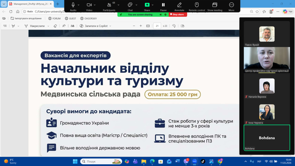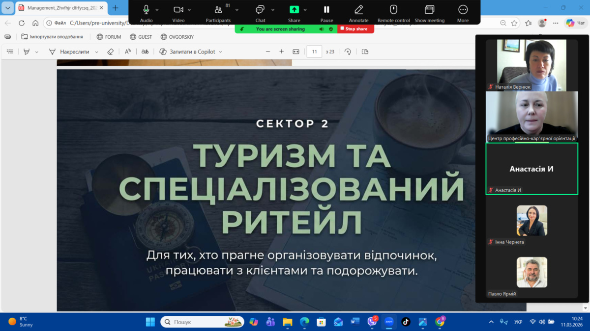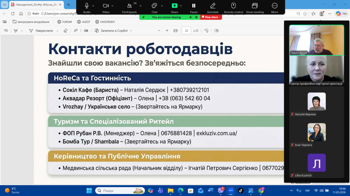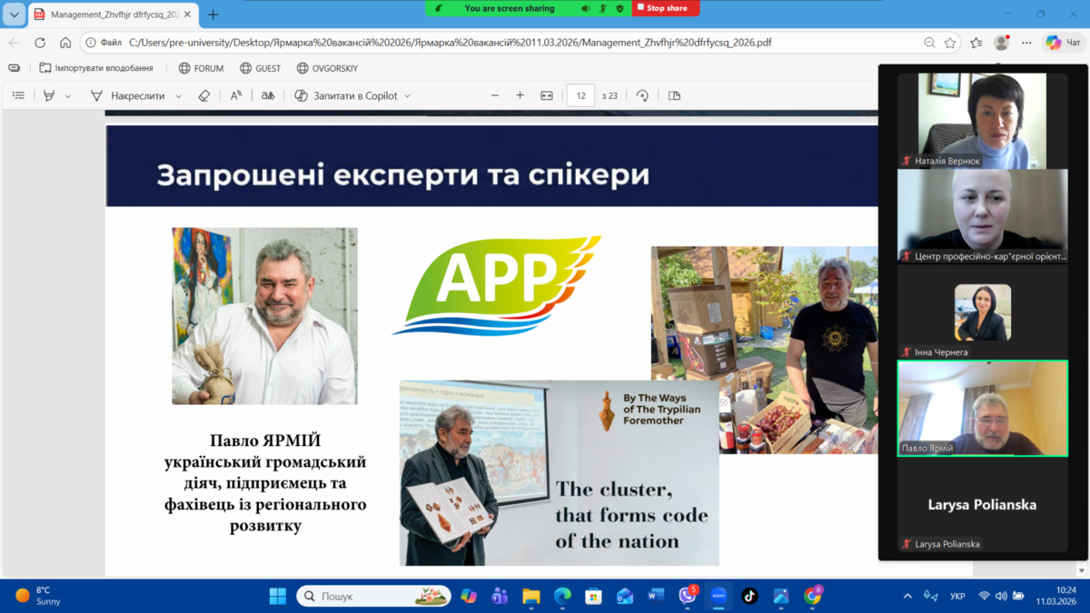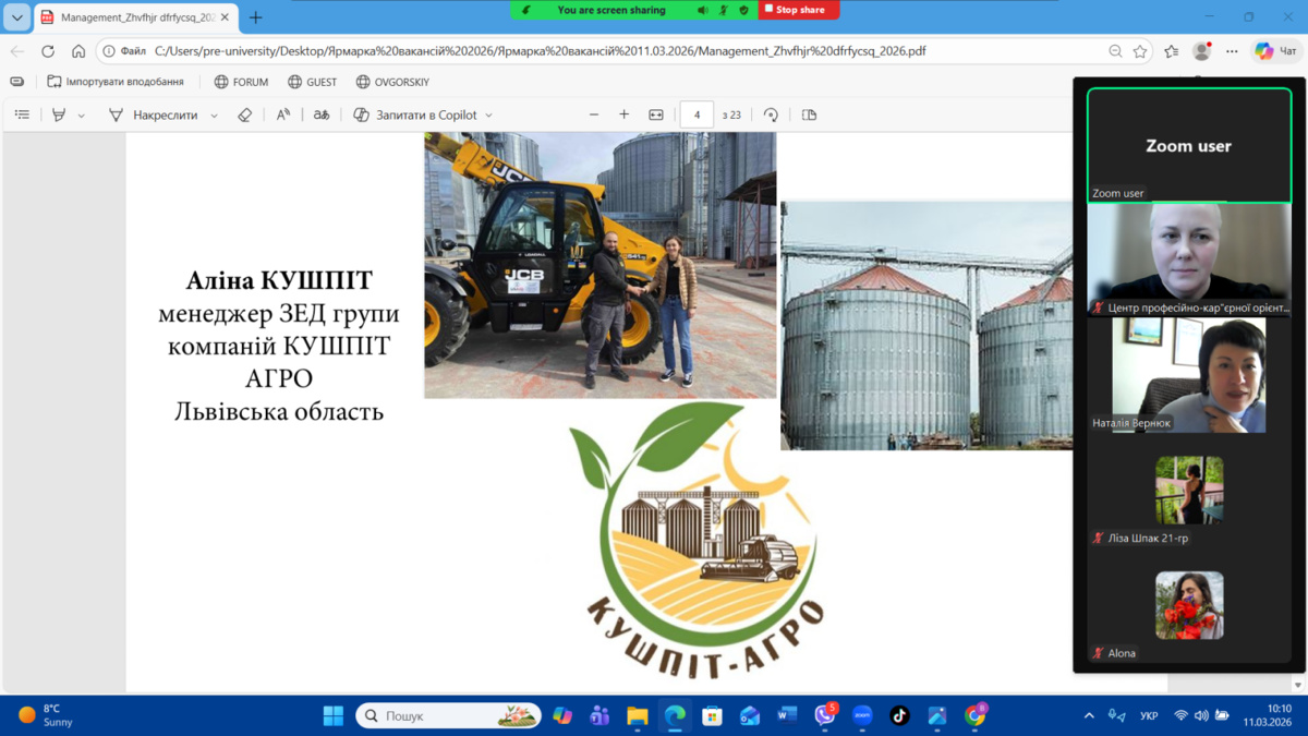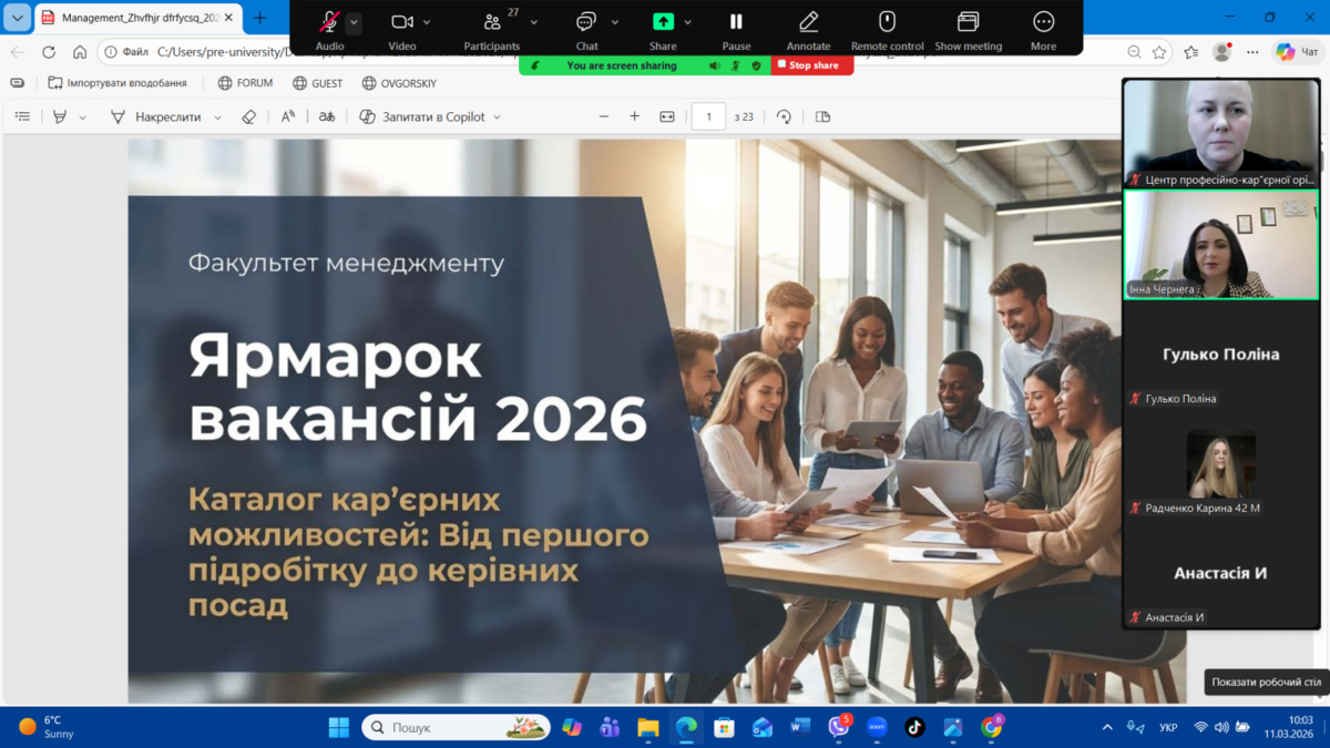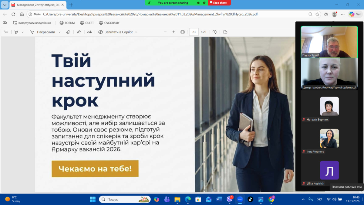 11 березня 2026 року на факультеті менеджменту Уманського національного університету відбувся Ярмарок вакансій–2026, організований Центром професійно-кар’єрної орієнтації та доуніверситетської підготовки. Метою заходу є сприяння у працевлаштуванні здобувачів освіти та налагодження прямого діалогу з роботодавцями-експертами у галузі, ознайомлення молоді з актуальними вимогами ринку праці та презентація кар’єрних можливостей для майбутніх фахівців.
