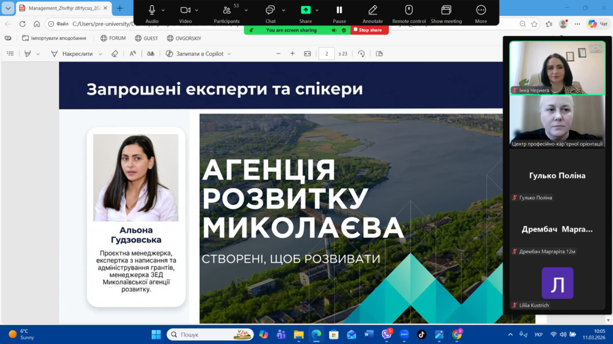 - Альона Гудзовська – проєктна менеджерка, експертка з написання та адміністрування грантів, менеджерка зовнішньоекономічної діяльності Миколаївської агенції розвитку;